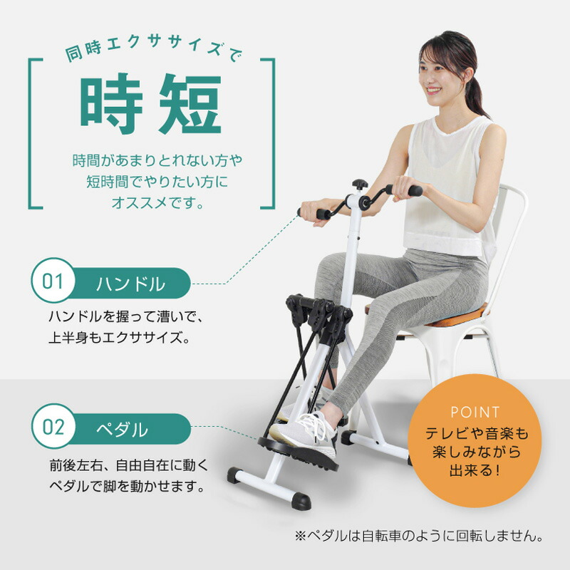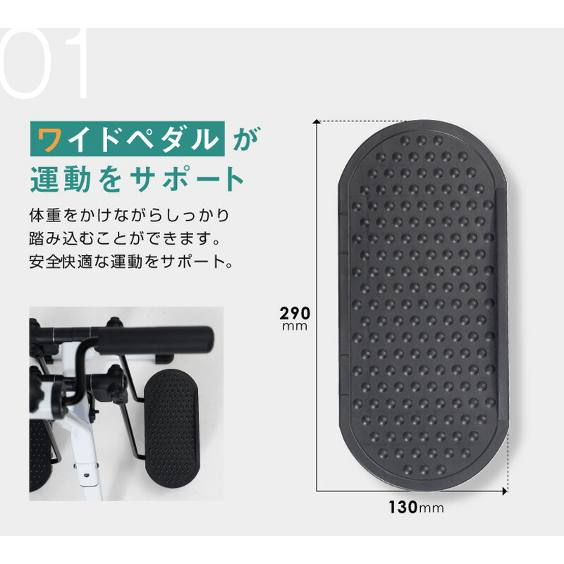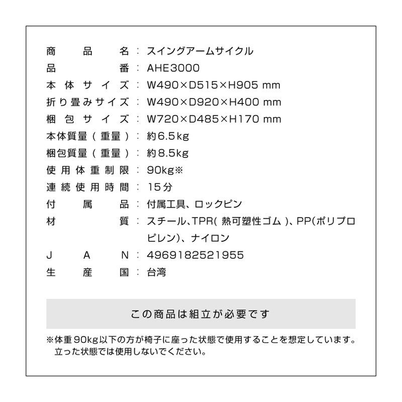 | スイングアームサイクル AHE3000は、上半身もエクササイズできるハンドル付きのエクササイズサイクルです。 前後左右、自由自在に動くペダルで幅広い筋肉を使いながらエクササイズできます。 また、同時にハンドルを回すことで上半身のエクササイズも可能です。 ハンドルの負荷はダイヤルを回すことで自由に調節できます。 ペダルは体重をかけながらしっかり踏み込むことができるワイドペダルで、安全・快適な運動をサポートします。 これ一つで上半身、下半身同時に鍛えることができ、椅子に座って運動できるので、運動初心者の方にもおすすめです。 ◎前後左右に動くペダルで下半身全体をエクササイズ ◎座りながら運動できる ◎上半身もエクササイズできるハンドル付 ◎ハンドル負荷調節可能 ◎快適な運動をサポートするワイドペダル ◎折りたたみ可能 商品名:スイングアームサイクル 品番:AHE3000 本体サイズ:W490× D515 × H905mm 折り畳みサイズ:W490× D920 × H400mm 梱包サイズ:W720 × D485× H170mm 本体質量(重量):約6.5kg 梱包質量(重量):約8.5kg 耐荷重:90kg(※) 連続使用時間:15分 組立:お客様組み立て 材質:スチール、TPR、PP、ナイロン JANコード:4969182521955 生産国:台湾 メーカー保証:ご購入日より1年間 (※)体重90kg以下の方が椅子に座った状態で使用することを想定しています。立った状態では使用しないでください。 |