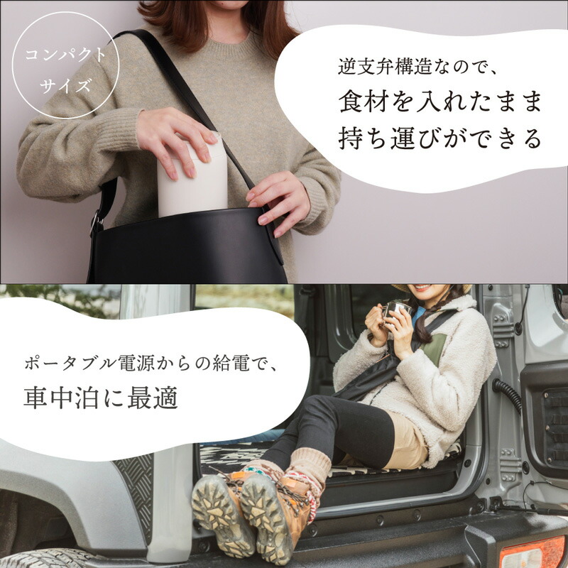 どこでも美味しく調理ができる逆支弁構造で、食材を入れたまま持ち運びができるので出先で出来立てのおかゆを食べられる。