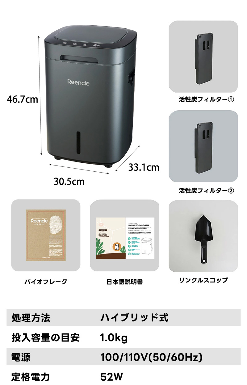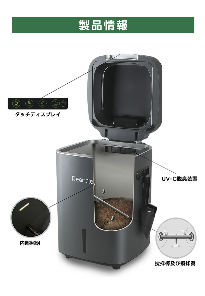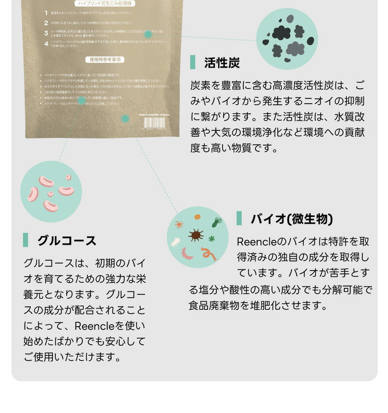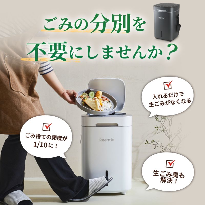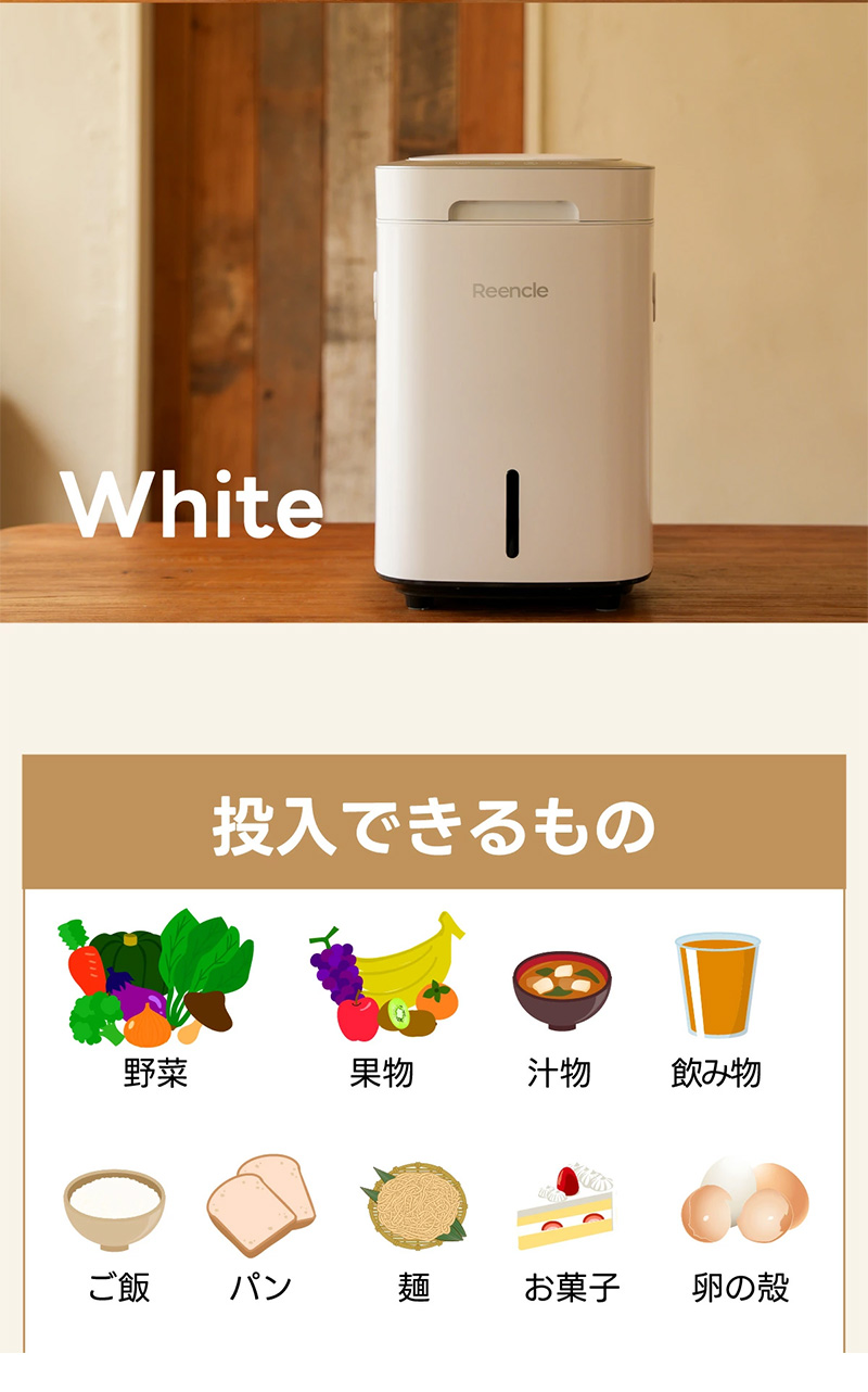 | Reencleは、ゴミの分解に最適な自然由来の有機微生物(バイオフレーク)を使い、ゴミの分解・処理・堆肥化を行うハイブリッド式生ごみ処理機です。 生ゴミだけでなく、ペットのフンなど自然分解が行われる物質を投入することも可能で、様々な用途でお使いいただけます。 食品廃棄物を減らすことができ、CO2などの温室効果ガスの排出を削減することに繋がり、環境汚染を防ぎます。 生ごみを入れてから約24時間で肥料としてお使いいただける土の状態に戻します。 1日1.7kgまで処理可能で7人家族まで対応可能です。 投入したごみは空気と水に分解され、残りが堆肥となります。 家庭菜園などの肥料としてお使いいただくか燃えるゴミとして処分いただけます。 投入したゴミを毎回取り出す必要はなく、機械一杯にたまったタイミング(約1カ月〜)で処分していただく方式のため、手間がほとんどかかりません。 ●強力脱臭システム ●25db以下の消音設計 ●消費電力は52Wの省エネ設計 ●安心安全の1年間保証 ■サイズ:長さ30.5cm×幅38cm×高さ46.7cm (蓋を開けた時の高さ:73cm) ■本体重量:9.1kg ■消費電力:52W ■投入容量の目安:1.0kg ■カラー:ホワイト、ブラック 本体サイズ(約):170×61×50mm 重量(約):170g ※持病や疾患のある方、肌の弱い方、ご使用に際して不安な方は使用できません。 |