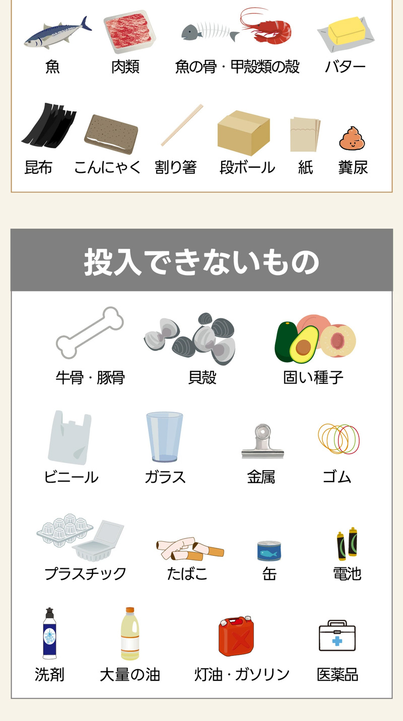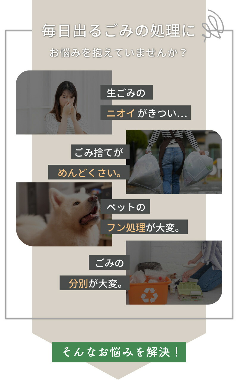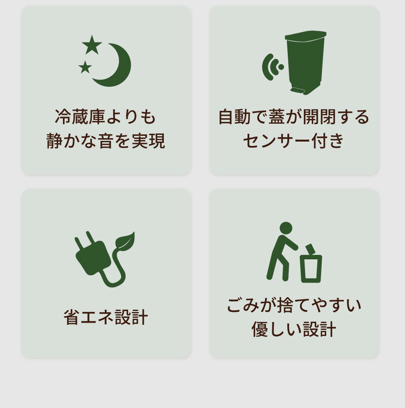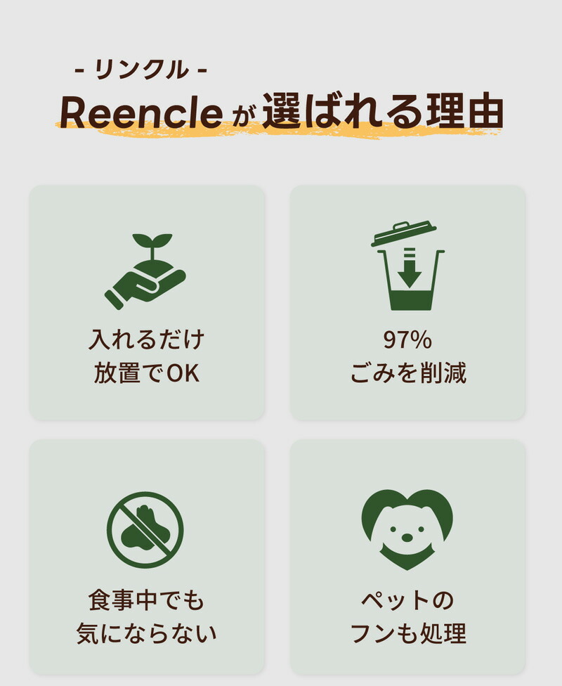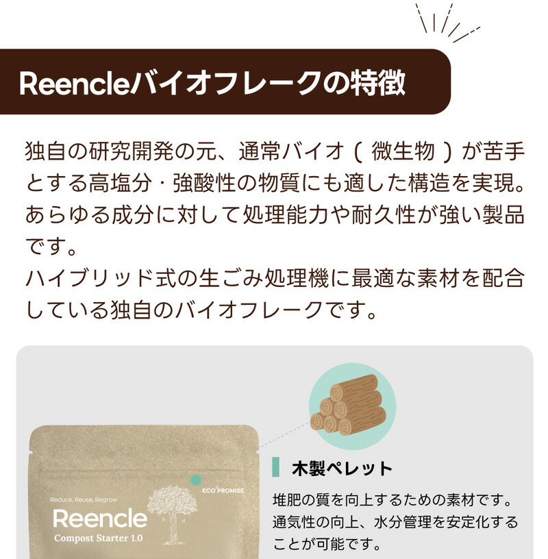 | Reencleは、ゴミの分解に最適な自然由来の有機微生物(バイオフレーク)を使い、ゴミの分解・処理・堆肥化を行うハイブリッド式生ごみ処理機です。 生ゴミだけでなく、ペットのフンなど自然分解が行われる物質を投入することも可能で、様々な用途でお使いいただけます。 食品廃棄物を減らすことができ、CO2などの温室効果ガスの排出を削減することに繋がり、環境汚染を防ぎます。 生ごみを入れてから約24時間で肥料としてお使いいただける土の状態に戻します。 1日1.7kgまで処理可能で7人家族まで対応可能です。 投入したごみは空気と水に分解され、残りが堆肥となります。 家庭菜園などの肥料としてお使いいただくか燃えるゴミとして処分いただけます。 投入したゴミを毎回取り出す必要はなく、機械一杯にたまったタイミング(約1カ月〜)で処分していただく方式のため、手間がほとんどかかりません。 ●強力脱臭システム ●25db以下の消音設計 ●消費電力は52Wの省エネ設計 ●安心安全の1年間保証 ■サイズ:長さ30.5cm×幅38cm×高さ46.7cm (蓋を開けた時の高さ:73cm) ■本体重量:9.1kg ■消費電力:52W ■投入容量の目安:1.0kg ■カラー:ホワイト、ブラック 本体サイズ(約):170×61×50mm 重量(約):170g ※持病や疾患のある方、肌の弱い方、ご使用に際して不安な方は使用できません。 |