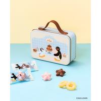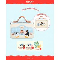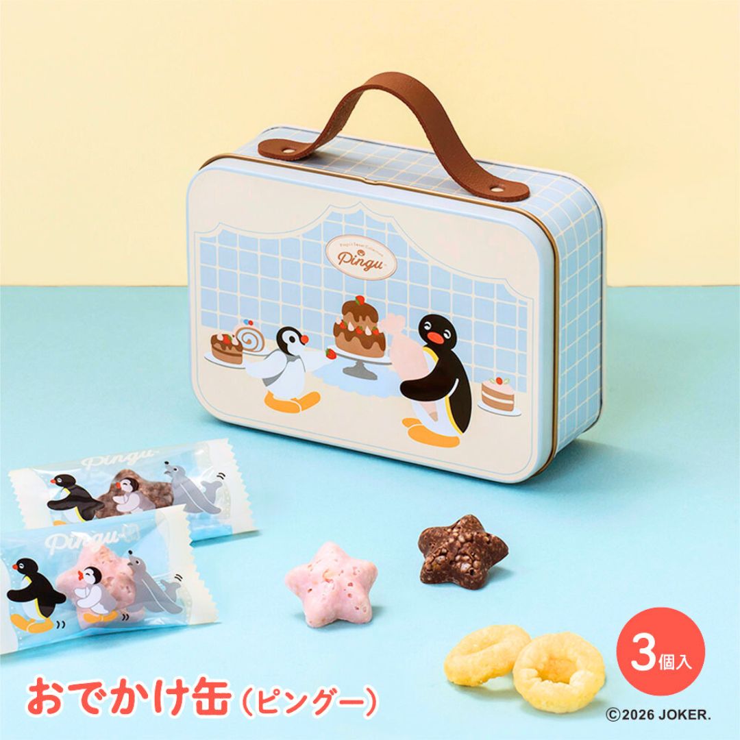お菓子を詰め合わせた、合皮の持ち手がかわいいトランク型缶。 ゆるかわいいイラストのピングーがデザインされた持ち手付きの缶に、2種のクランチチョコとキャラメルスナックを詰め合わせました。 缶の裏面にも、可愛らしいピングーたちがデザインされています。
