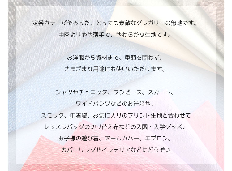 定番カラーがそろった、とっても素敵なダンガリーの無地です。