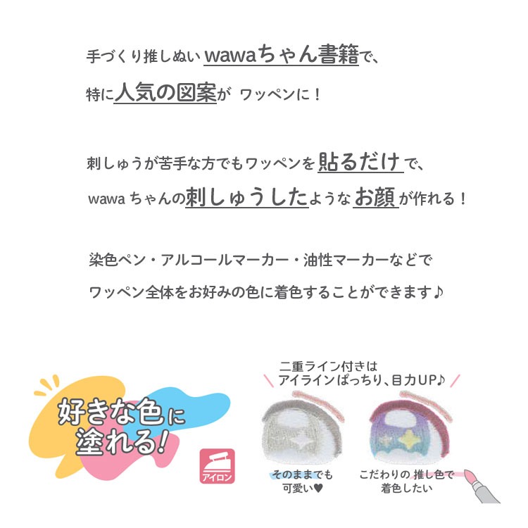 刺しゅうが苦手な方でもワッペンを貼るだけで、wawa ちゃんの刺しゅうしたようなお顔が作れる!