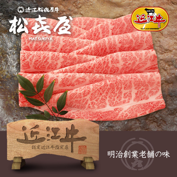 近江牛の中でも特別に厳選した最高級の特選牛で食通の方から絶賛をされています。カタロース肉はややあっさりとした中にも霜降りの甘みが噛むほどに口いっぱいに広がります。すき焼き・しゃぶしゃぶ、どちらでも召し上がっていただけるように、「松喜屋」独自の厚さでスライスしております。