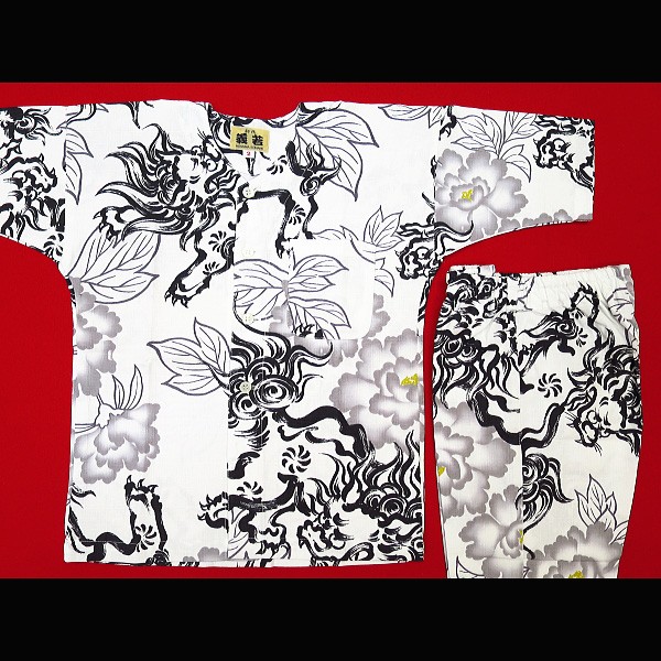 鯉口シャツ 唐獅子牡丹(白)7号サイズ(140)子供鯉口シャツ上下組 義若オリジナル