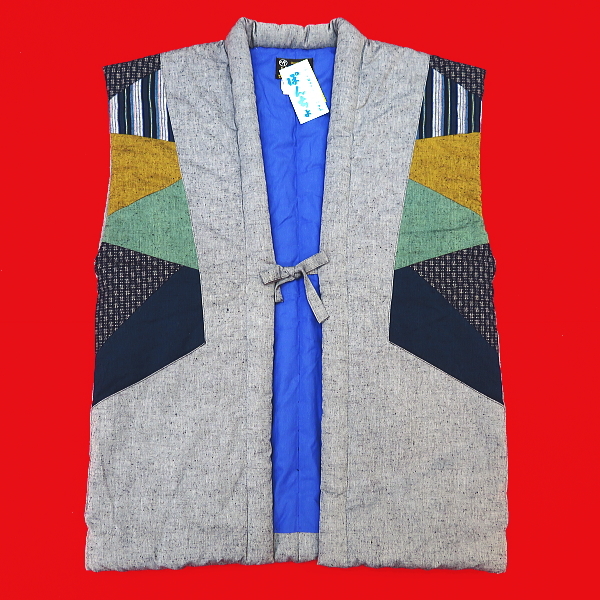 本場久留米!綿入れ半纏袖なしポンチョ!パッチワークA(グレー) 男性用フリーサイズ 日本製
