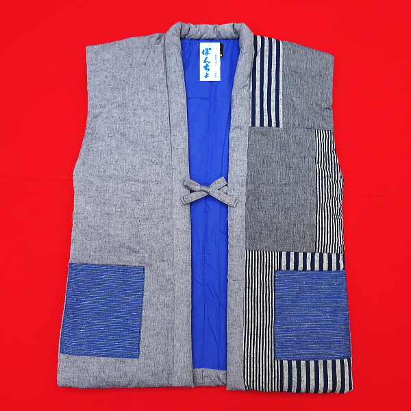本場久留米!綿入れ半纏袖なしポンチョ!パッチワークC(グレー) 男性用フリーサイズ 日本製