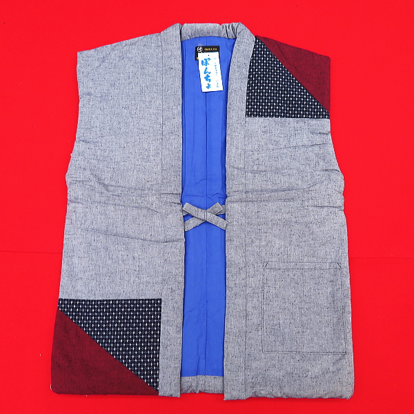 本場久留米!綿入れ半纏袖なしポンチョ!パッチワークD(グレー) 男性用フリーサイズ 日本製