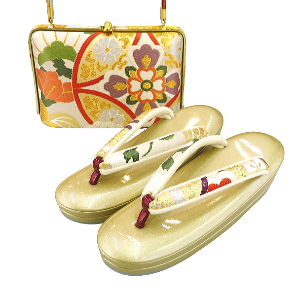◆高品質な和装・礼装用の草履バックセットです。◆西陣織の帯地をバッグと鼻緒に使用した贅沢な逸品です。◆上品なゴールド生地の草履台と、西陣織の帯地の鼻緒が高級感のあるお品です。◆また、太目の鼻緒ですので履いたときに足の甲へのあたりが優しく痛くなく履きやすいです。◆振袖・留袖・訪問着・附け下げ・色無地等、様々なフォーマルお着物に最適です。◆結婚式成人式お宮参り七五三入学式卒業式入園式卒園式など様々なシーンに活躍します。【バッグサイズ】高さ:約13.5cm幅:約23.0cm奥行き:約9.5cm(持ち手の長さ含まず)【草履サイズ】台長さ約24.5cm/台の幅(中央)約8cm/かかと高さ約6cm(推奨適応サイズ)23.0cm〜25.0cmくらいまで【素材】バッグ正面/裏面/持ち手・草履鼻緒:正絹西陣織草履台/前坪:合成皮革草履裏底面:合成皮革※商品の柄の出方は生地の裁断によりひとつひとつ異なり、商品画像の柄の出方とは異なる場合がございます。爆買