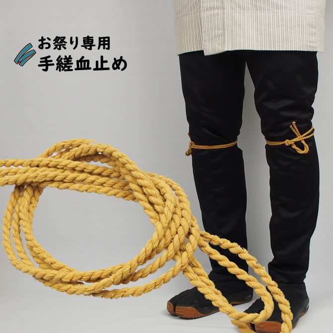江戸時代に飛脚や篭屋が長距離を走る際に、ひざの下にヒモをきつく巻いて、うっ血を防止する役割で使用されるようになった血止め。現在ではお祭り衣装のワンポイントファッションとして使用されています。 手縒り血止め(てよりちどめ)は祭すみたや限定オリジナルの血止めです。当店の職人さんが一本一本手で縒って制作しています。