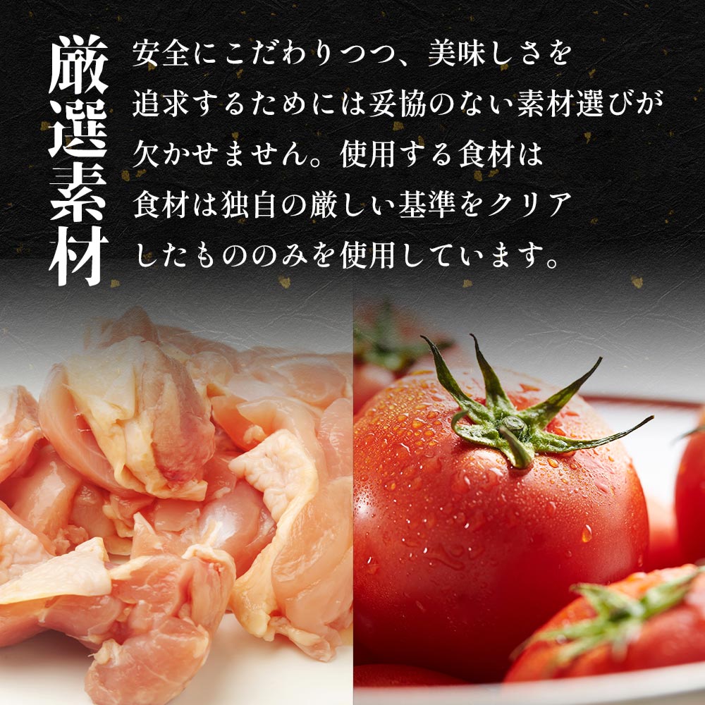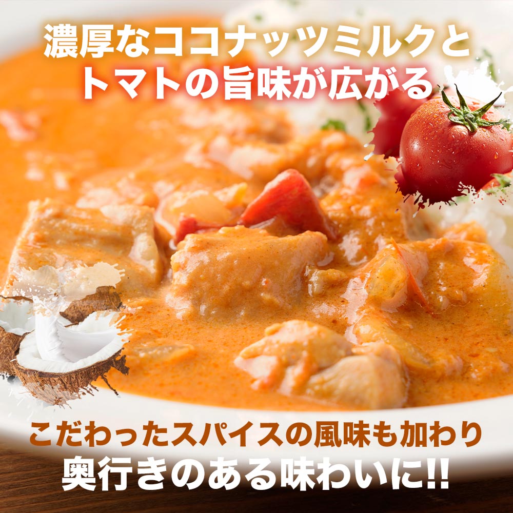 ココナッツミルク(タイ製造)、トマト・ジュースづけ、鶏肉、たまねぎ、バター、トマトジュース(濃縮トマト還元)、りんごピューレ、ソテーオニオン、トマトペースト、牛脂、はちみつ、にんにく、ビーフエキス調味料、クリーミングパウダー、ガラスープの素、小麦粉、カレー粉、練りごま、食塩、野菜ペースト、ウスターソース/調味料(アミノ酸等)、pH調整剤、塩化カルシウム、カゼイン、香料、乳化剤、酸化防止剤(ビタミンC、ビタミンE)、増粘多糖類、(一部に小麦・乳成分・牛肉・ごま・大豆・鶏肉・豚肉・りんごを含む)