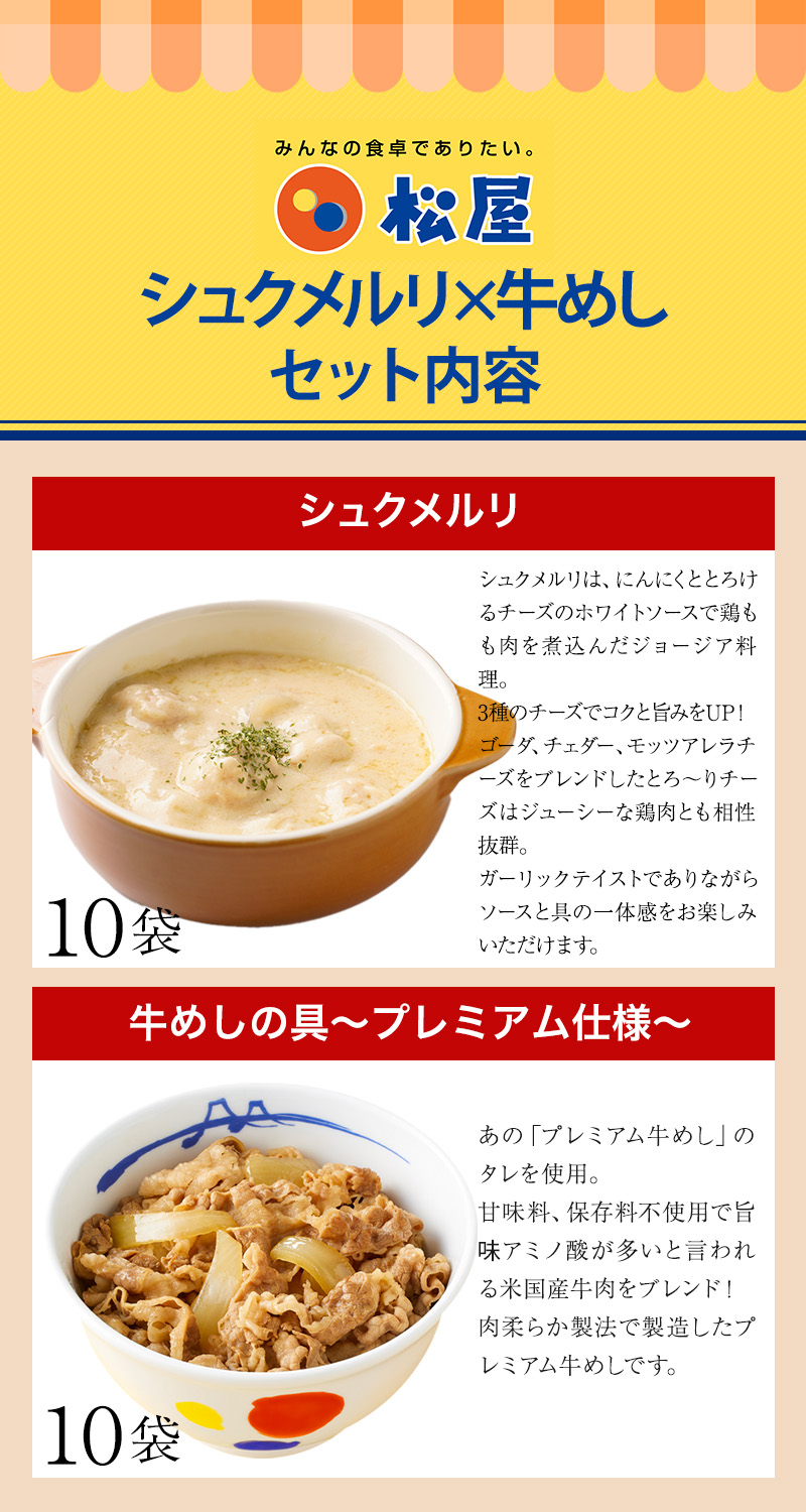 (衝撃の57%OFF) 牛めしの具(プレミアム仕様)10食とシュクメルリ10食 計20食セット お取り寄せ お惣菜 おかず セット 保存食 松屋 受験生応援 非常食