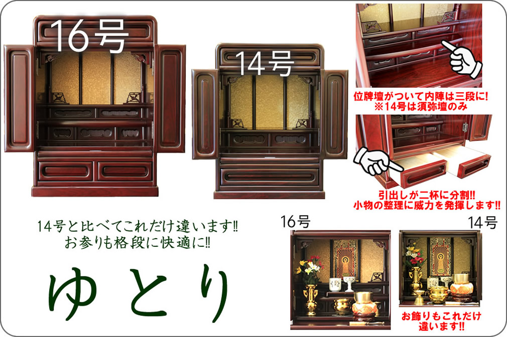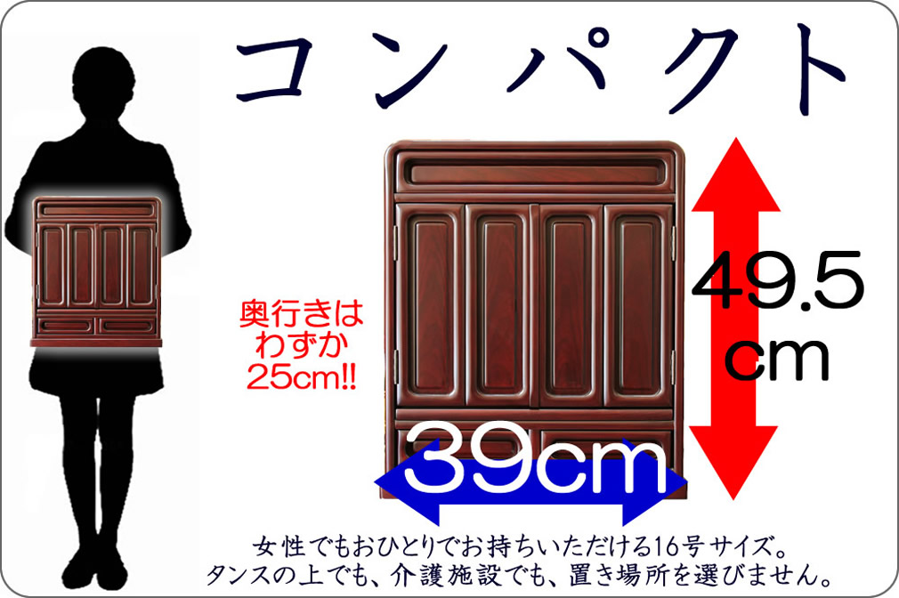 コンパクトにまとめたい、でも14号ではちょっと物足りない、そんな方へピッタリの16号サイズの一式セット。 お仏壇を置きたいけど、何を買ったらいいのかわからない...。 そのような方には是非このセットをオススメいたします。 仏間がない方やリビングのサイドボードの上に置きたい方にもピッタリのコンパクトサイズ。 そしてこのサイズながら必要にして十分な機能を兼ね備えた人気のお仏壇です。 さらにお飾りに必要な仏具に加えて過去帳と過去帳台をセットしてお届け。届いたその日からお参りいただくことができます。何を揃えたら良いのかわからない方、とにかく早く一式揃えたい方には最適のセットです。