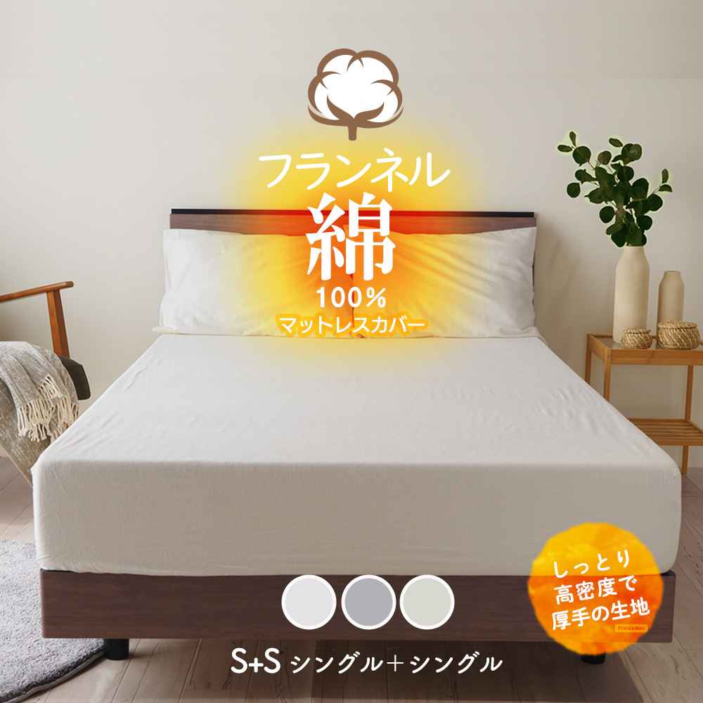 マットレスカバー シングル+シングル(幅195cm) あったか 冬用 綿100% フランネルコットン 高密度 厚みしっかり G27