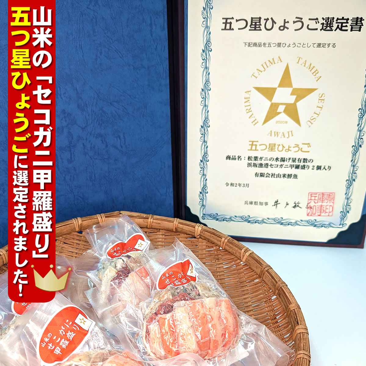 兵庫県新温泉町、浜坂漁港の仲買人「山米鮮魚」が、目利きで選んだセコガニ(親ガニ・松葉ガニのメス)を贅沢な甲羅盛りに仕上げました。