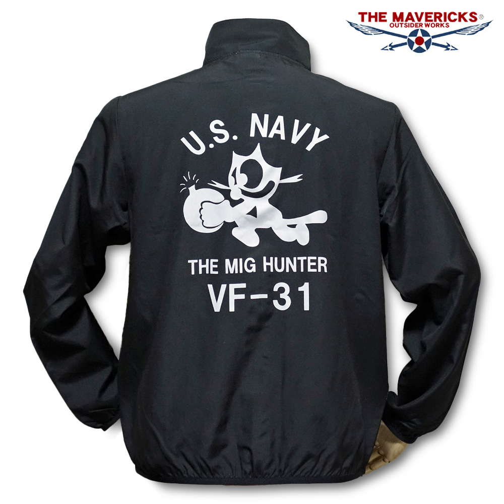 前面左胸にはステンシルデザインで「USN」マーク、背面には爆弾キャット&航空隊VF-31・MIG.HUNTERのロゴが入ったモデル