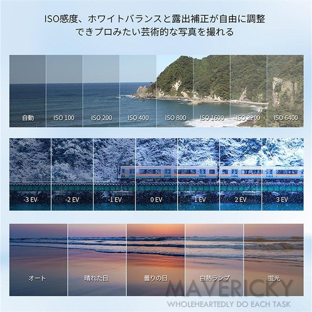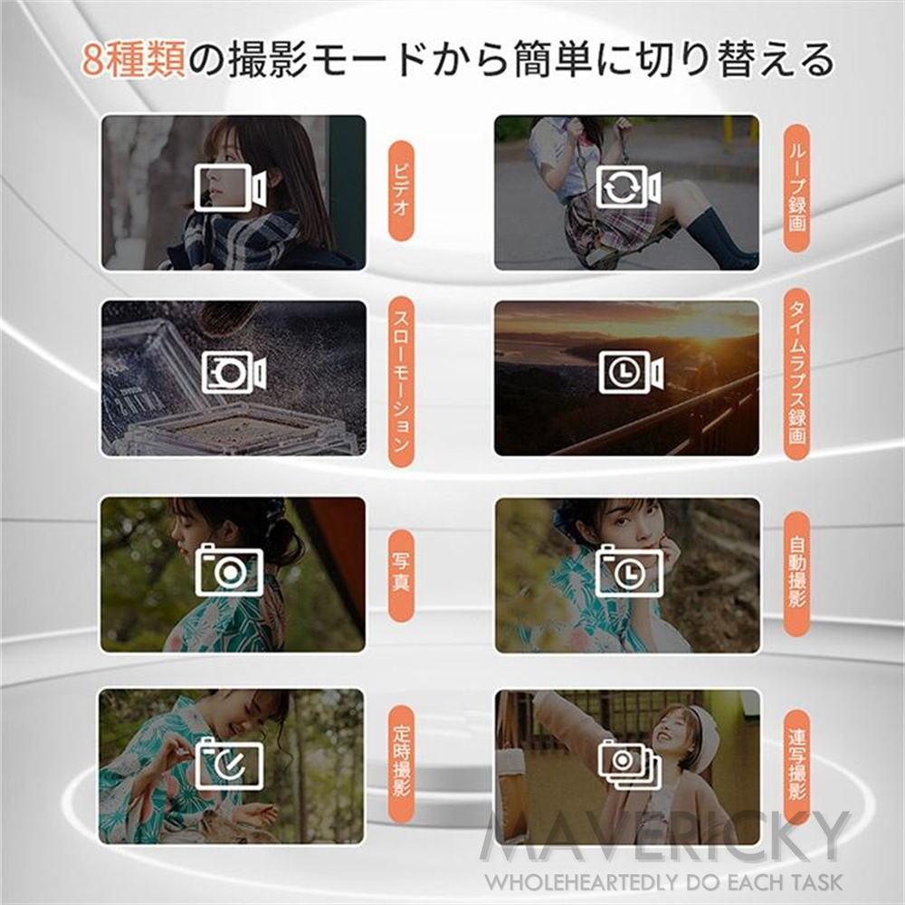 ビデオ、ループ録画、スローモーション、タイムラプス録画、写真、自動撮影、定時撮影、連写撮影