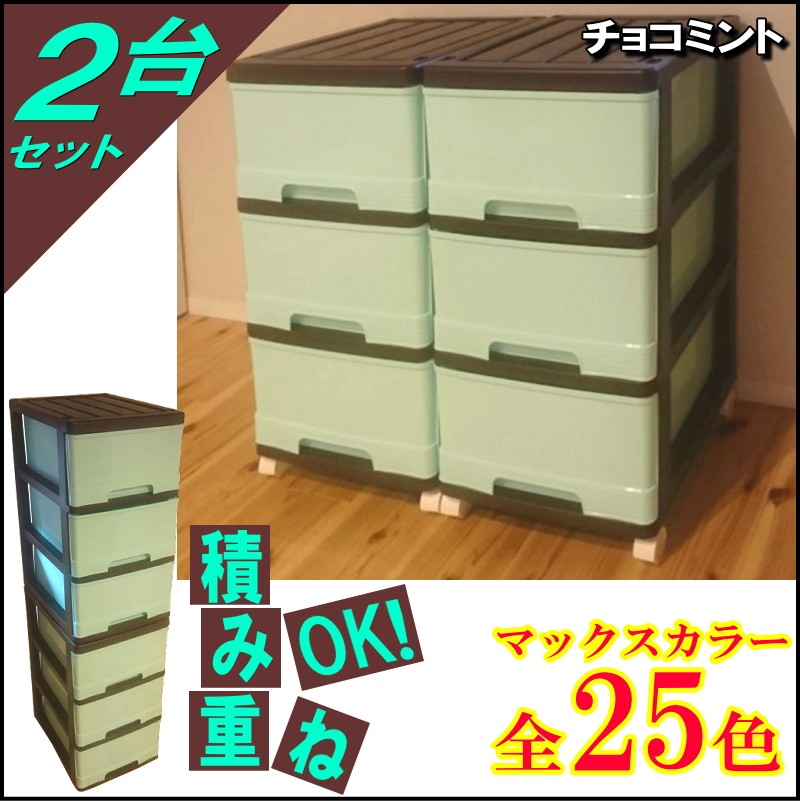 収納ケース プラスチック 引き出し 深型 3段 2個組 おしゃれ チョコミント スリム キャスター付き 幅34.5cm 奥行41.5cm 高さ69.4cm 全25色 完成品 日本製