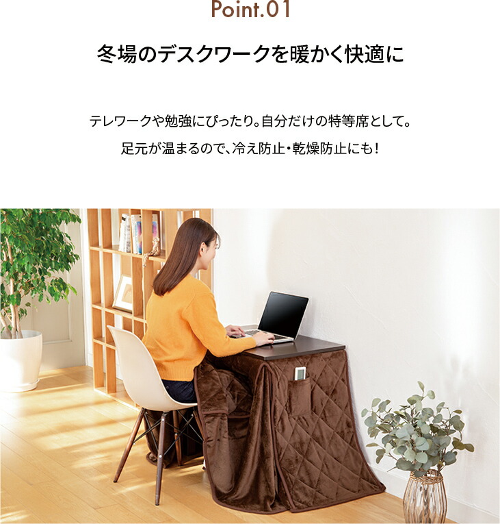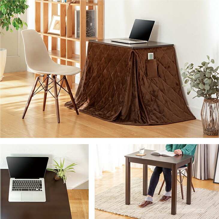 冬はこたつとして、春から秋は布団を外してスマートなパソコンデスクや学習机として活躍します。椅子に座ったまま温まれるため、立ち座りがスムーズ。一人暮らしの方から受験生、ご年配の方まで幅広く重宝します。
