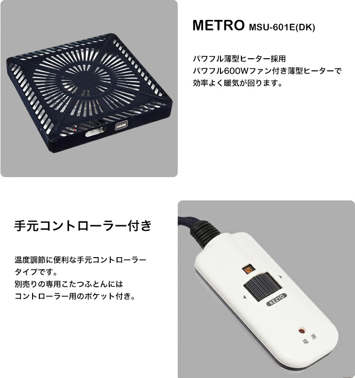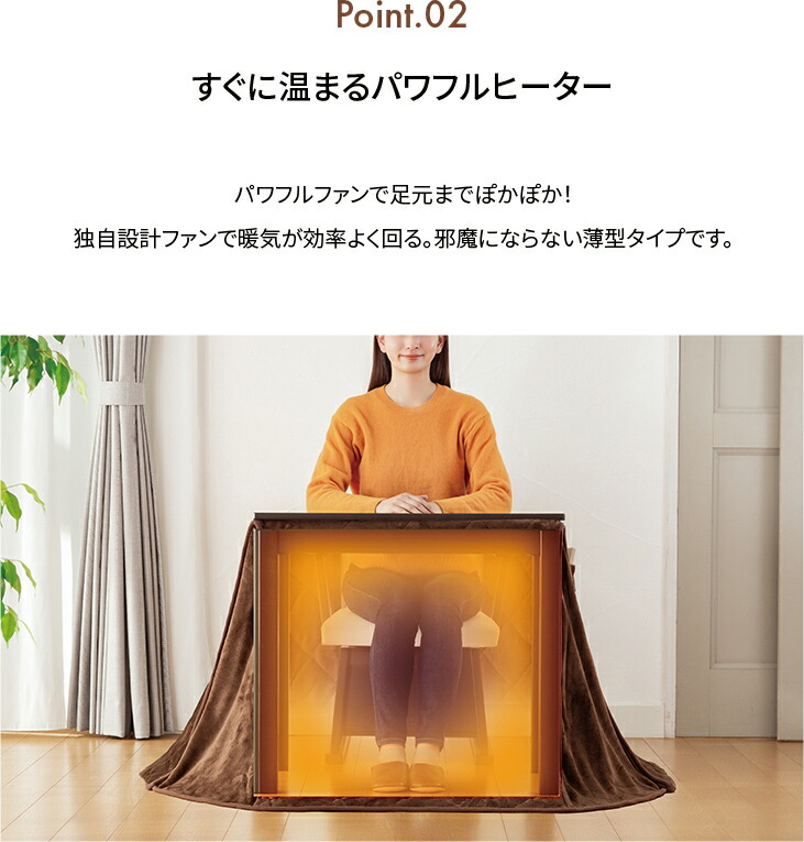 すぐに温まる500Wの石英管ヒーターを搭載。ファンが暖気を効率よく循環させるため、足元までしっかり温もりを届けます。ヒーターは薄型設計で膝上にゆとりがあり、ゆったりとした姿勢で過ごせます。