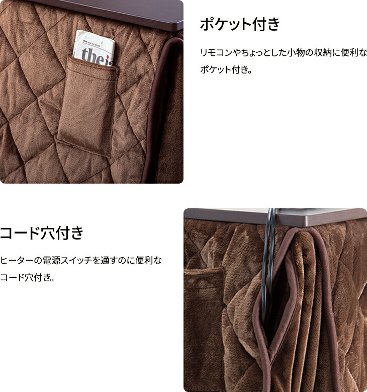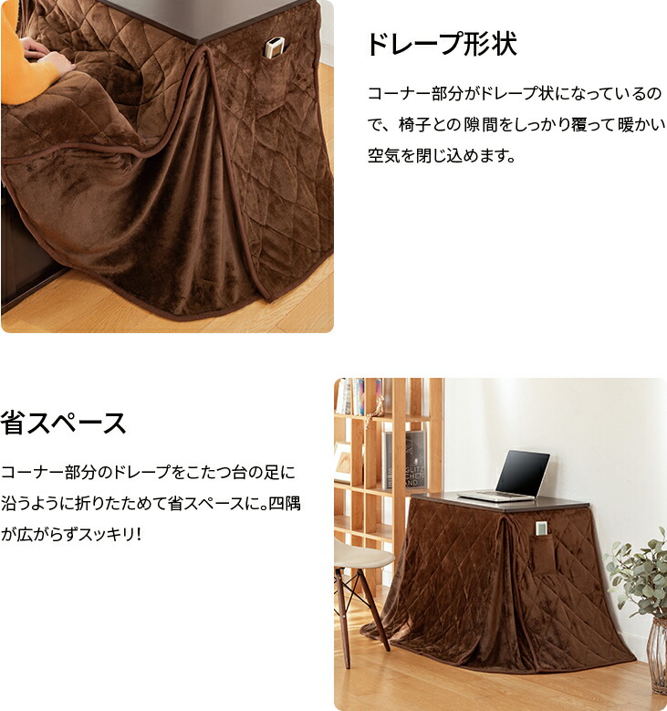 コーナーにスリットが入った専用布団は、広がらずに場所を取りません。両面フリースのような肌触りの良いフランネル生地を採用。リモコンポケットやコード穴も付いており、使い勝手にもこだわった設計です。