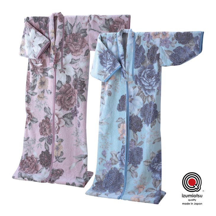 吸水性・耐久性に優れたタオル地国産かいまき。毛布と同じ地系にパイルを縛る作り方でパイルが抜けにくく耐久性抜群!衿部分もパイル仕様で心地良い肌触り。柄はぼかした涼し気なおぼろ調プリント。夏は一枚で肌掛けに、冬は内掛けにと、一年中ご使用いただけます。