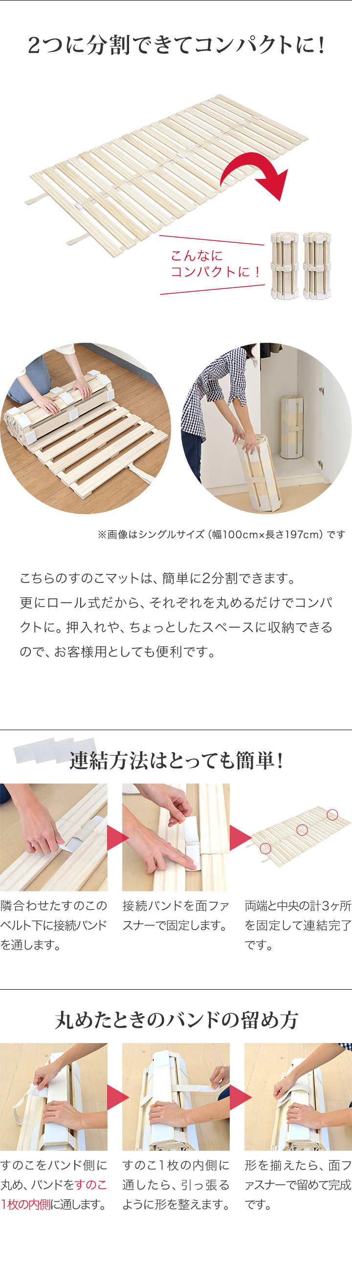 収納に困りがちなマット。このすのこマットは連結タイプでロール式なので、それぞれを丸めるだけでコンパクトに。押入れやちょっとしたスペースに収納ができるので、お客様用としても活用するのにも便利です。また、桐材は軽い木材なので、女性一人でも持ち運びできます。