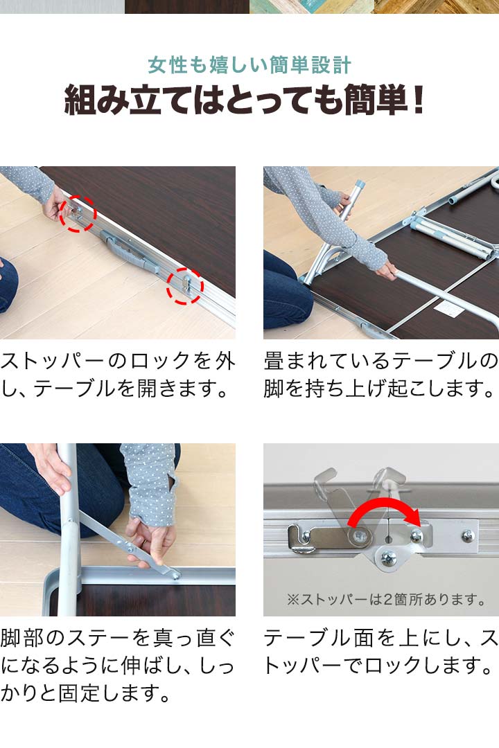 | 特記事項: ※平らで安全な場所を選び、凸凹、段差のある場所や不安定な場所での使用は避けてください。 ※テーブルの端やコーナー部分に手を乗せて体重をかけたり、片側にだけ重いものを載せないでください。また、テーブルをゆすったりしないでください。 ※耐熱温度は150℃ですが、150℃を超える物を載せると、天板のメラミン樹脂が変色・剥がれなどを起こす場合がございます。加熱された鍋などを直接天板に置くことはお避けください。 |