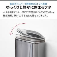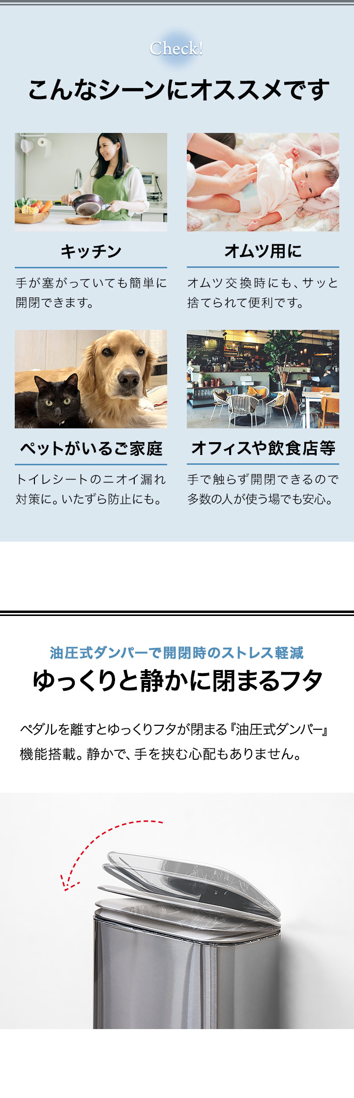 ペダルを離すとゆっくりフタが閉まる、ガスダンパー機能搭載。静かで、手を挟む心配もありません。