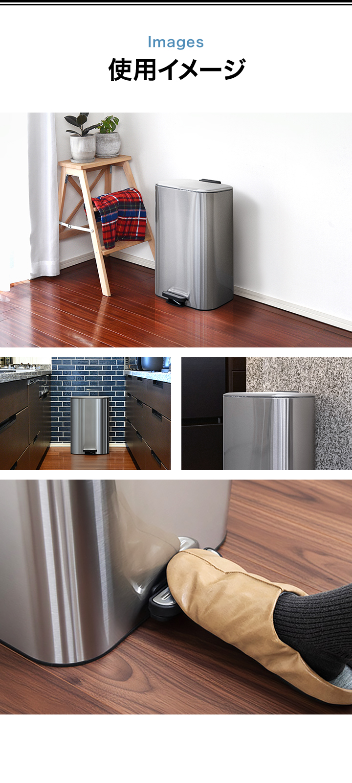 ステンレスの外観がスマートなごみ箱。足元のペダルで開閉ができ、衛生的にお使いいただけます。