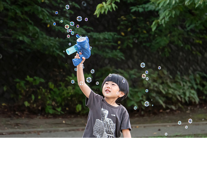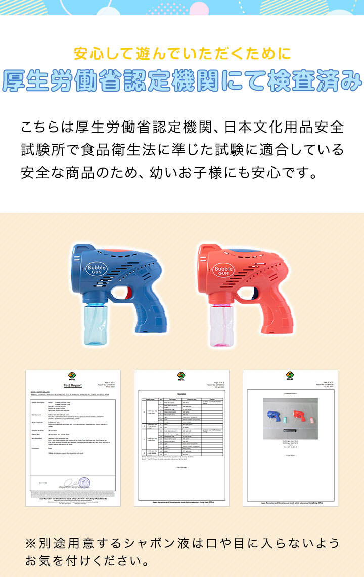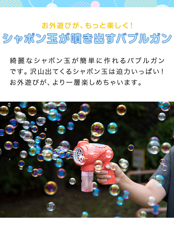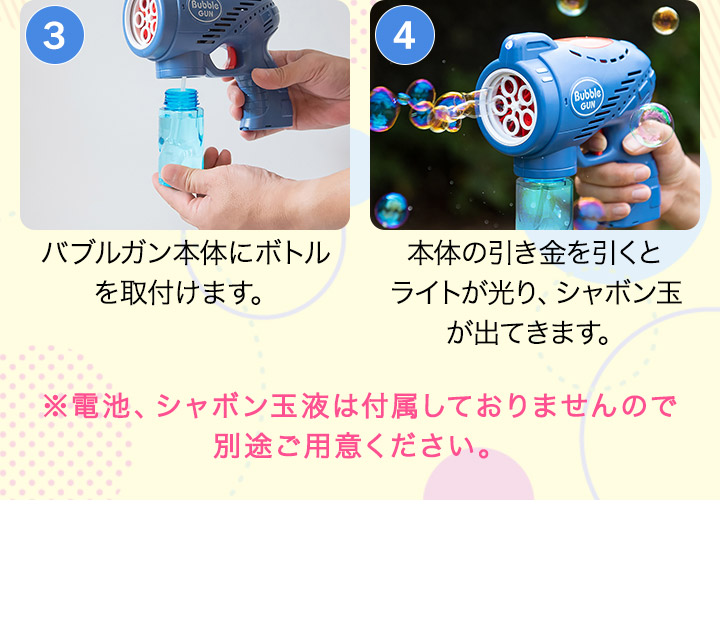 | 特記事項: ・本商品に乾電池、シャボン玉液は付属しておりません。 ・お子様を遊ばせる際は必ず保護者の方が付き添い、危険な遊び方をしないよう監視し、常に目を離さないでください。 ・シャボン玉液が目に入った場合は、すぐに水で洗い流してください。 ・シャボン玉液が入っている状態でバブルガン本体を逆さにしないでください。内部に液がこぼれ、故障の原因になります。 |