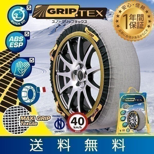 | 特記事項: ※本製品は繊維素材の緊急用滑り止めです。 ※適合サイズにおいても車両との干渉がある場合はご使用をお止め下さい。 ※スノーグリップテックス装着時は、時速40km以下で走行してください。 ※本製品は乗用車専用です。 ※冬用タイヤ規制時やチェーン規制時には通行できない場合がありますのでご注意ください。 ※ご使用の際には付属の取扱説明書をよくお読みのうえ、正しく装着し慎重に運転してください。 ※本製品はフランスで規格されマレーシアで生産しております。 |