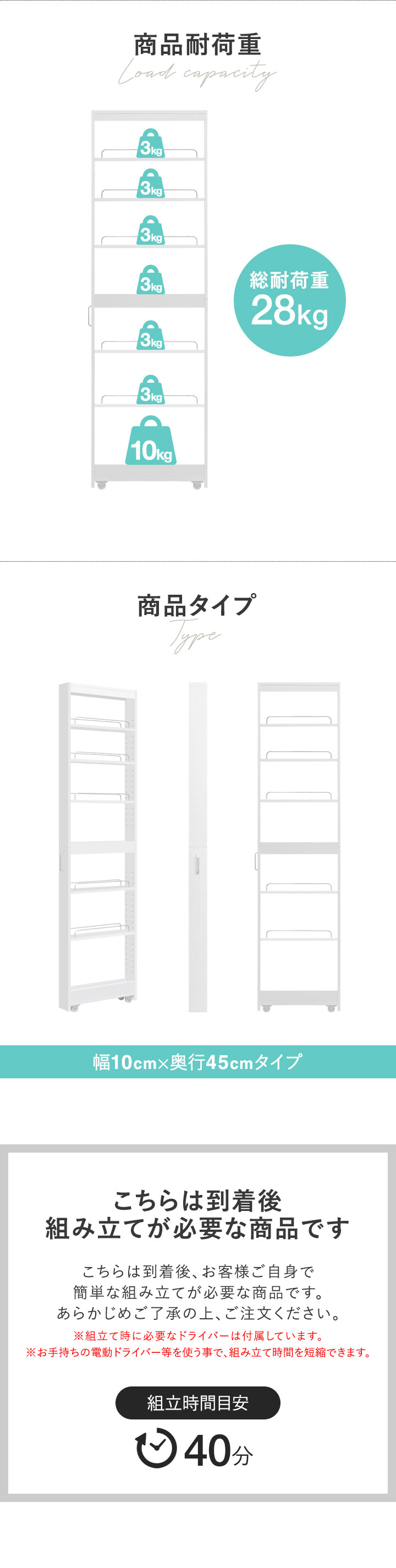 | 耐荷重: 1〜6段目:(約)3kg 最下段:(約)10kg 全体:(約)28kg |
