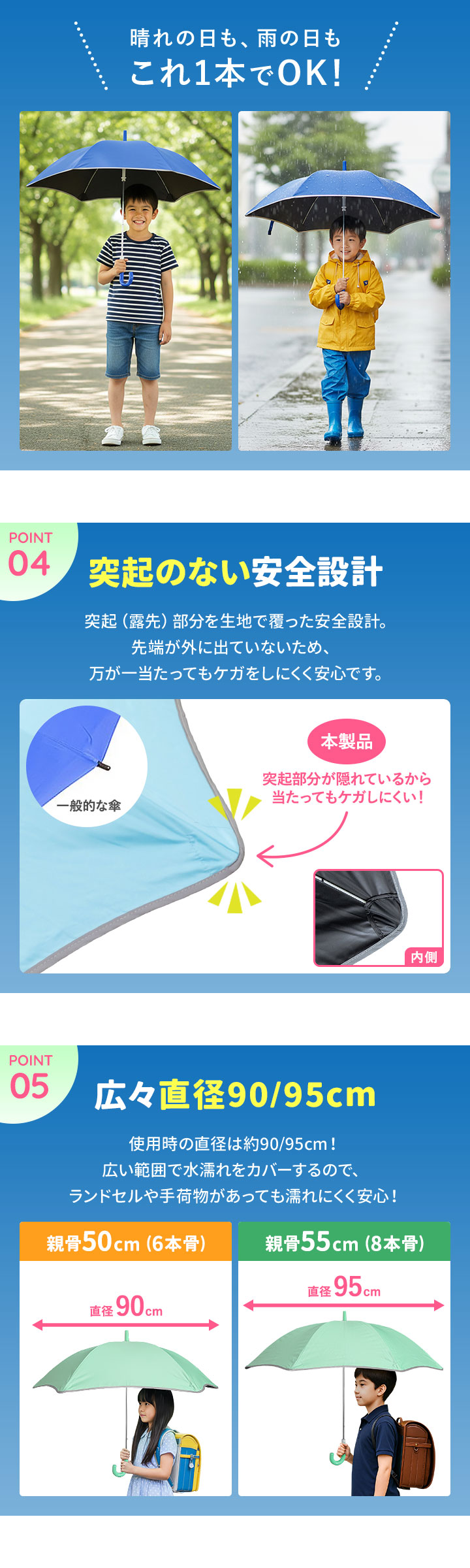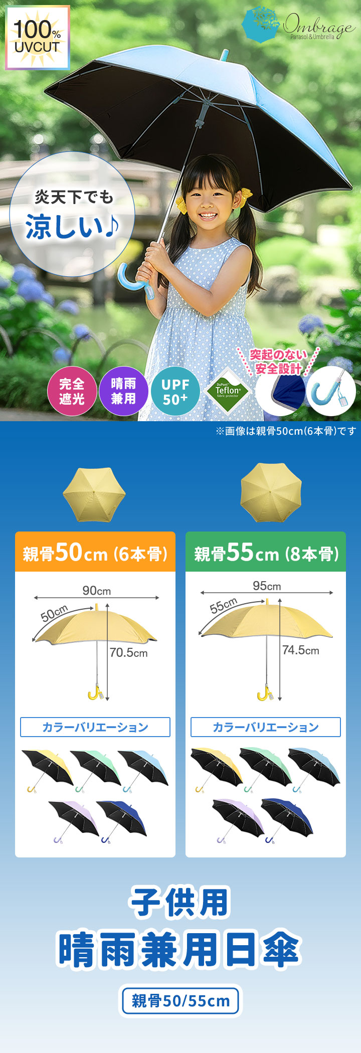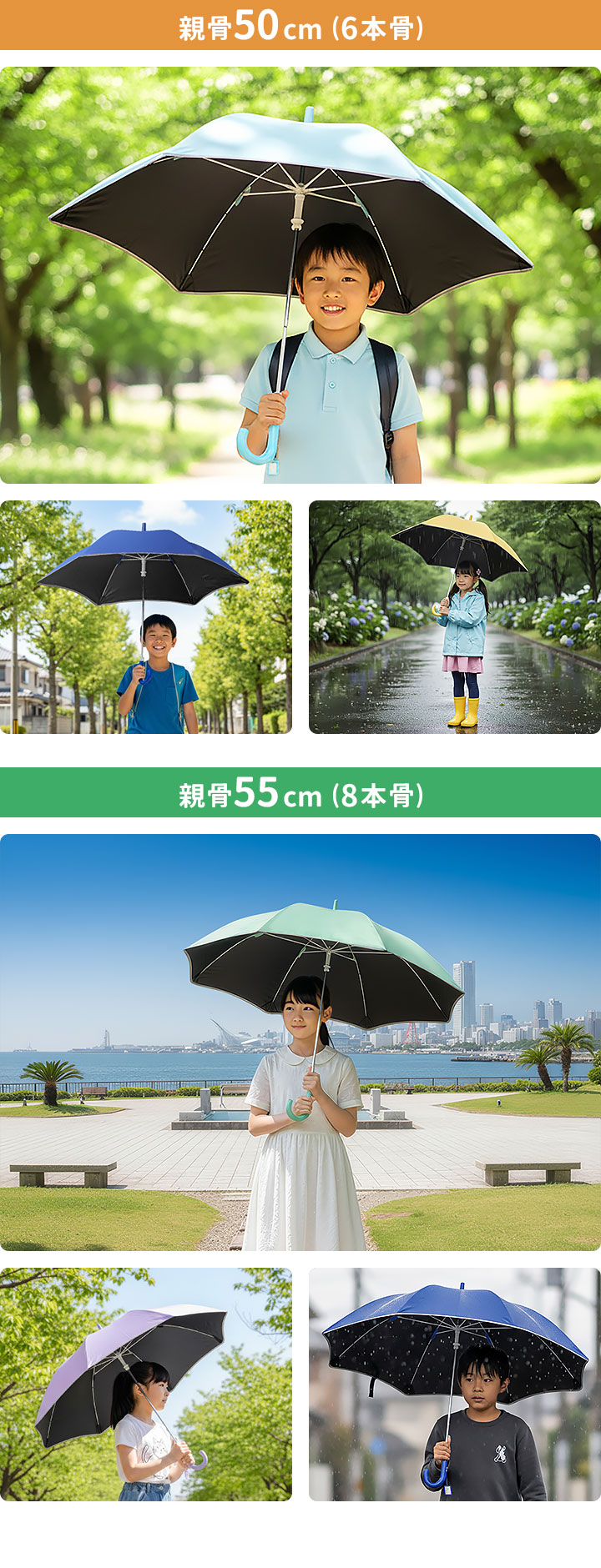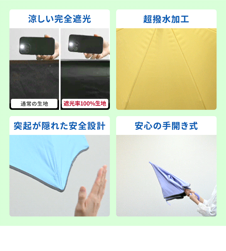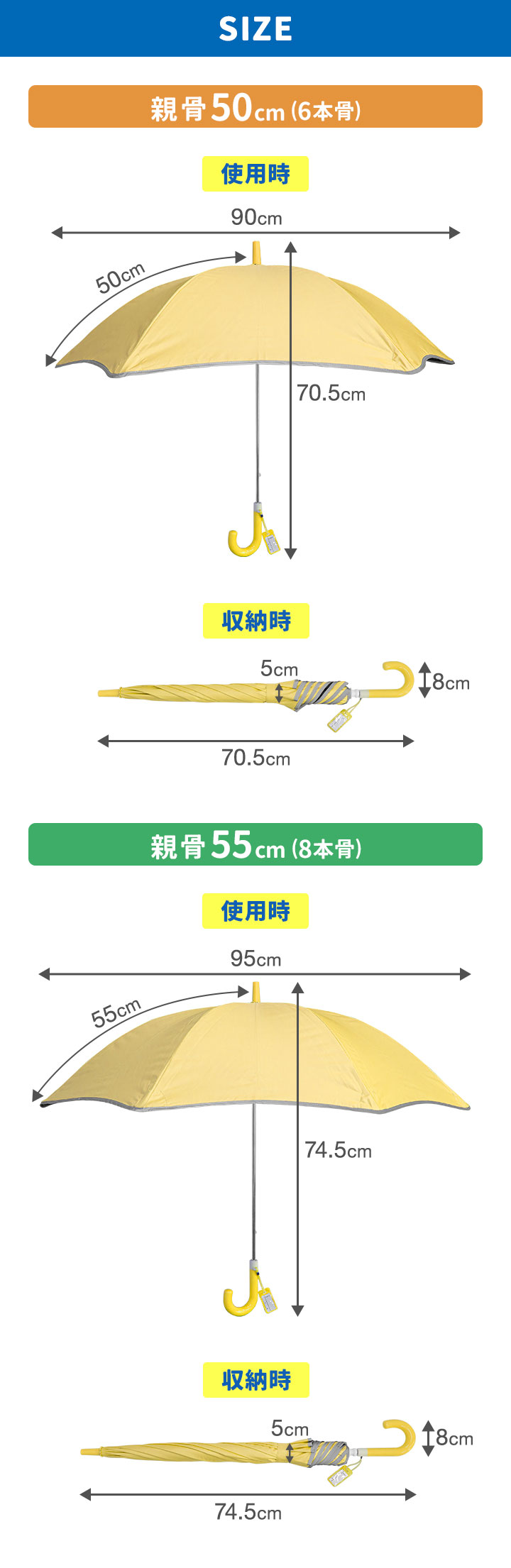 | サイズ: 【親骨50cm(6本骨)】 使用時:(約)直径90cm×長さ70.5cm 収納時:(約)幅8cm×長さ70.5cm 【親骨55cm(8本骨)】 使用時:(約)直径95cm×長さ74.5cm 収納時:(約)幅8cm×長さ74.5cm |