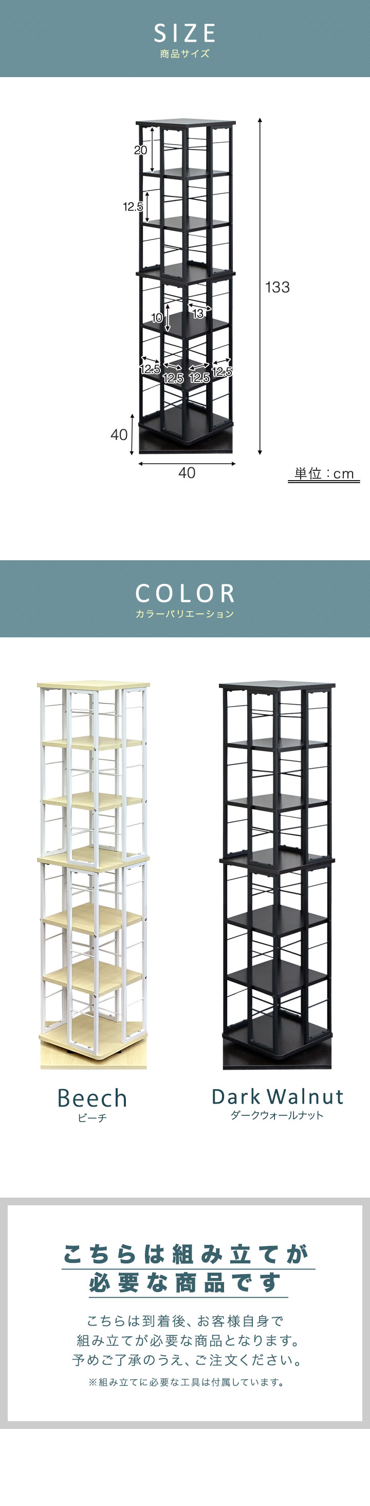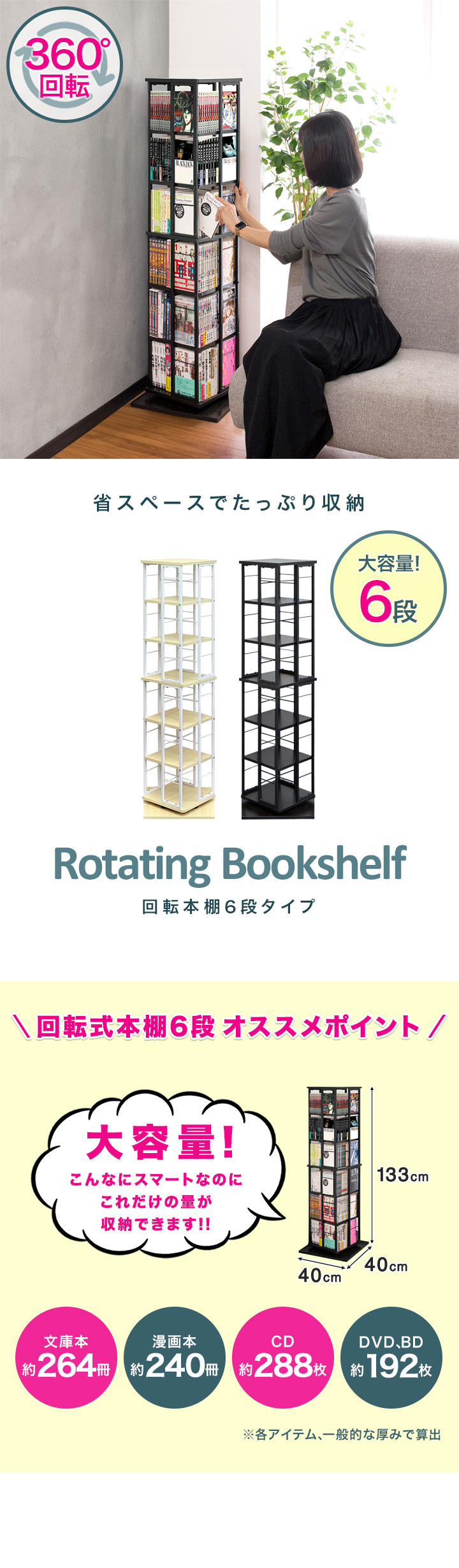 本棚 回転 6段 スリム 大容量 回転式本棚 幅40×40cm 高さ133cm 4面 360度回転 省スペース 収納 コミックラック タワーラック 棚 回転棚 1年保証 送料無料