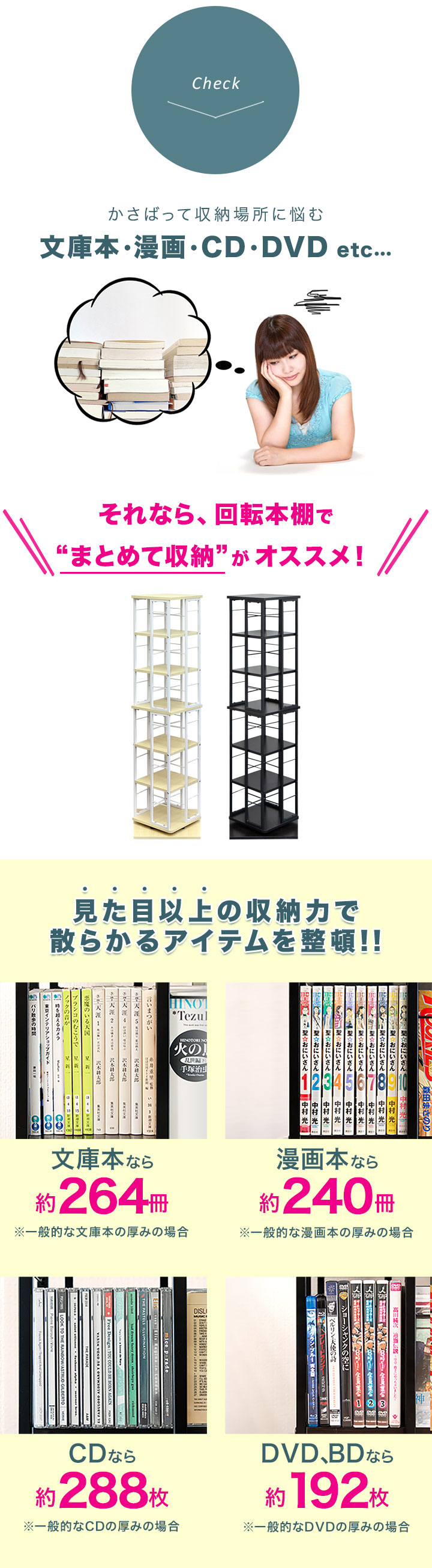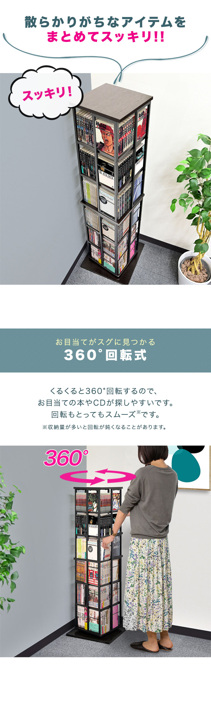 360度回転するタワー型本棚。大容量なので場所を取らずに文庫本や漫画本をスッキリと収納できます。