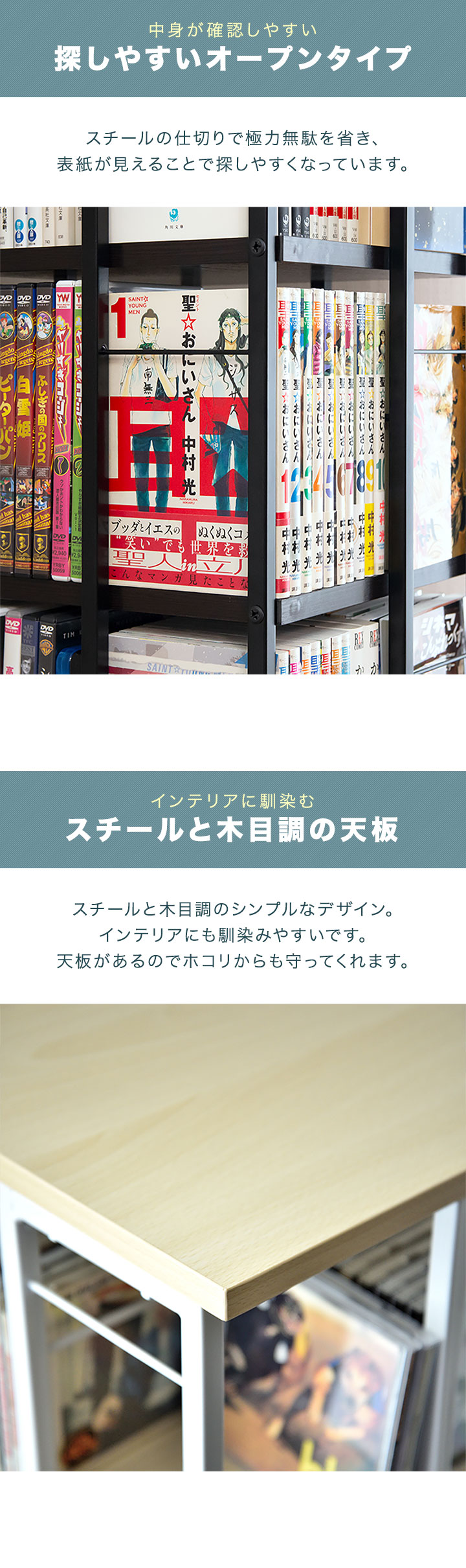 インテリアにも馴染みやすいスチールと木目調のシンプルなデザイン。天板があるのでホコリからも書籍を守ります。