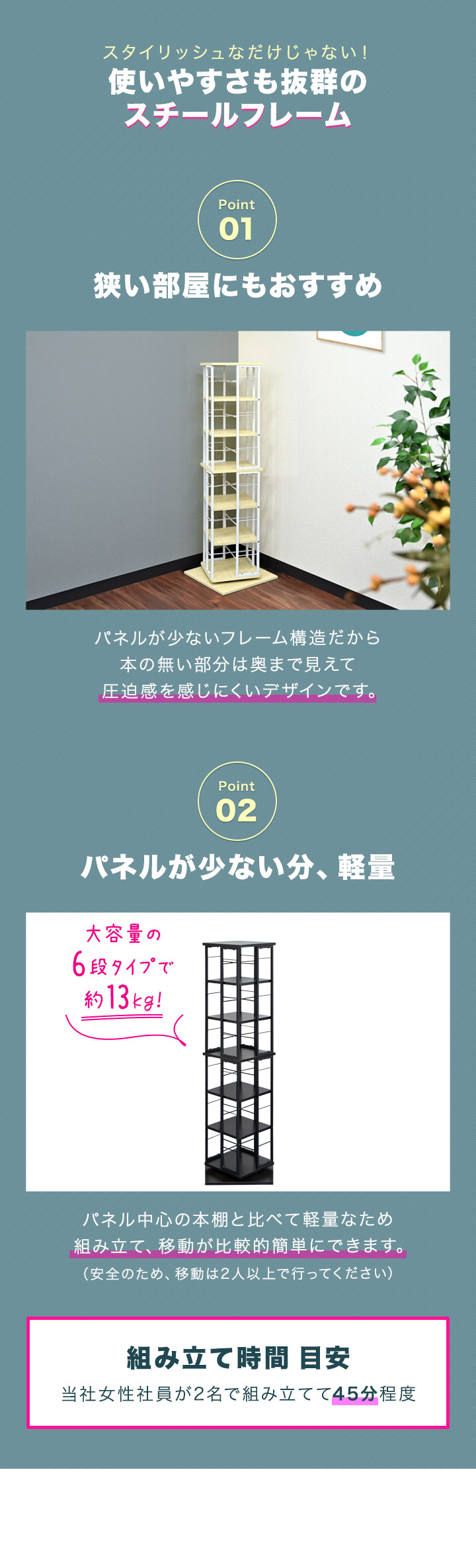 パネルの少ないフレーム構造なので本を収納していない部分は奥が見えて圧迫感を感じにくいデザインです。また、重要も軽く組み立て・移動も比較的簡単に行えます。