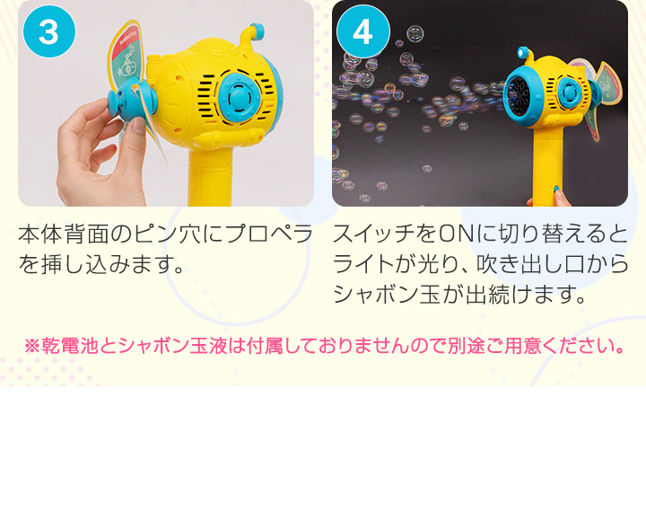 | 特記事項: ・本商品に乾電池、シャボン玉液は付属しておりません。 ・バッテリーカバーの開閉時は、別途プラスドライバーが必要です。 ・お子様を遊ばせる際は必ず保護者の方が付き添い、危険な遊び方をしないよう監視し、常に目を離さないでください。 ・シャボン玉液が目に入った場合は、すぐに水で洗い流してください。 ・シャボン玉液が入っている状態でバブルガン本体を逆さにしないでください。内部に液がこぼれ、故障の原因になります。 |
