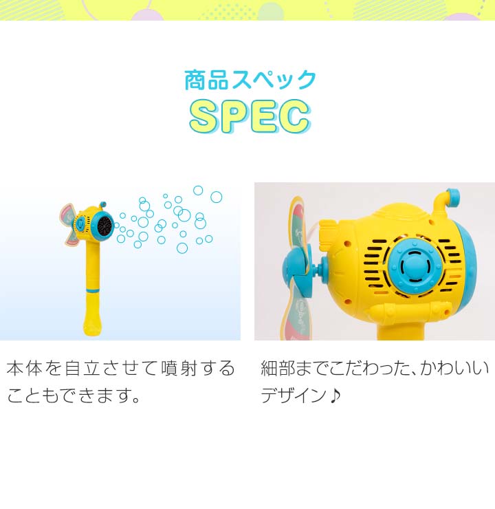 | サイズ: バブルステッキ本体:(約)14cmx8cm×34cm ※噴出口1個あたりの直径:(約)8mm |