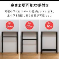 天板の下にはスチール棚が付いています。上中下3段階で高さ変更が可能なので、お好みに合わせてお使いいただけます。