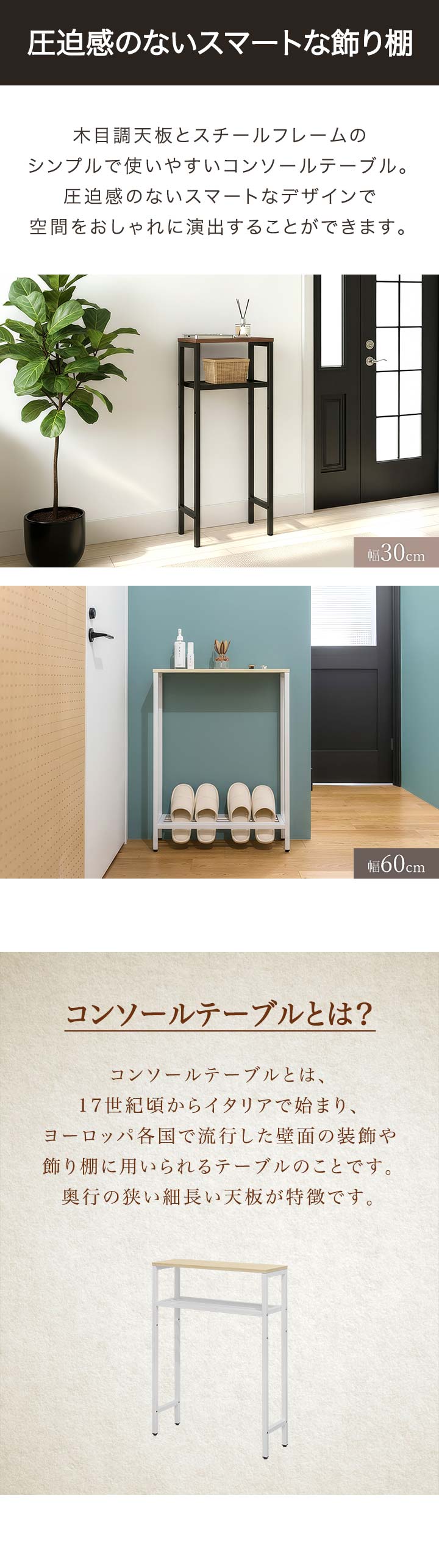 木目調天板とスチールフレームのシンプルで使いやすいコンソールテーブル。圧迫感のないスマートなデザインで空間をおしゃれに演出することができます。