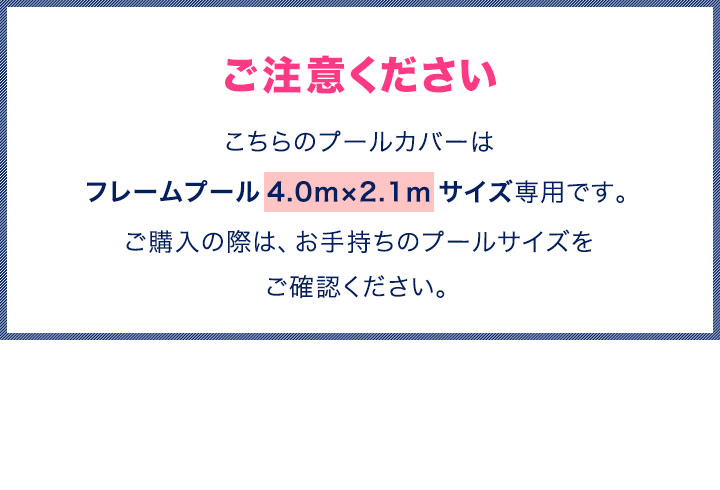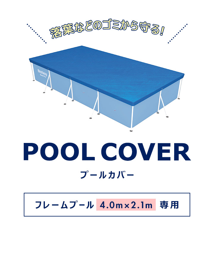 こちらのプールカバーはBESTWAY フレームプール 4.0m×2.1mサイズ専用です。ご購入の際は、お手持ちのプールサイズをご確認ください。