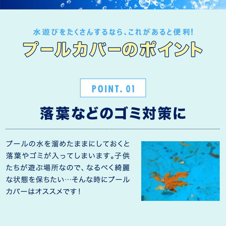 プールの水を溜めたままにしておくと落葉やゴミが入ってしまいます。子供たちが遊ぶ場所なので、なるべく綺麗な状態を保ちたい…そんな時にプールカバーはオススメです!