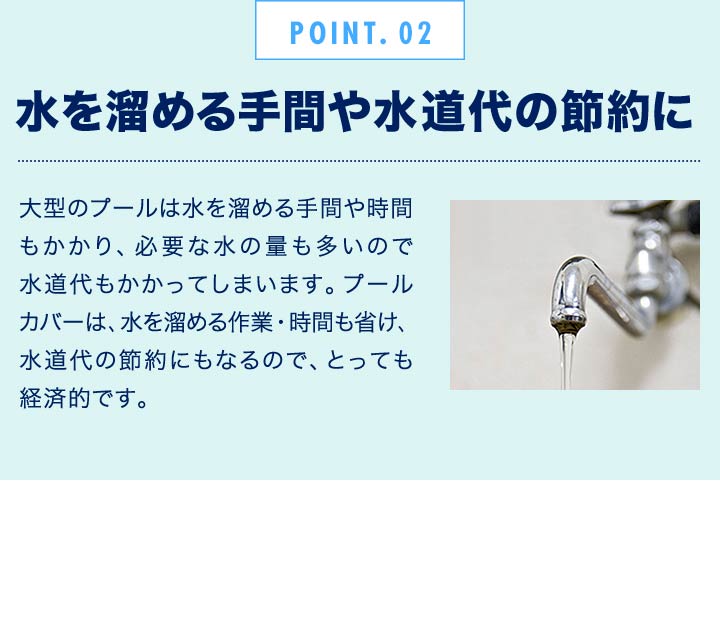 大型のプールは水を溜める手間や時間もかかり、必要な水の量も多いので水道代もかかってしまいます。プールカバーは、水を溜める作業・時間も省け、水道代の節約にもなるので、とっても経済的です。