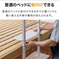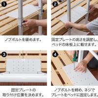 | 特記事項: ※こちらの商品はお客様組み立てとなります。(工具は付属しております) ※下記のベッドでは本製品を取り付けることができません。 ・取り付け箇所がMDF(繊維板)や合板などの強度が弱いもの ・電動リクライニングベッド ・金属製のベッド ・ベッド床板またはサイドフレームの高さが設置床面から51cmを超え、8cmを下回るもの ※底面のクッションにシリコンを利用してる為、材質の特性上、接触・摩擦による床材へ色移りすることがありますので、ご注意ください。 |