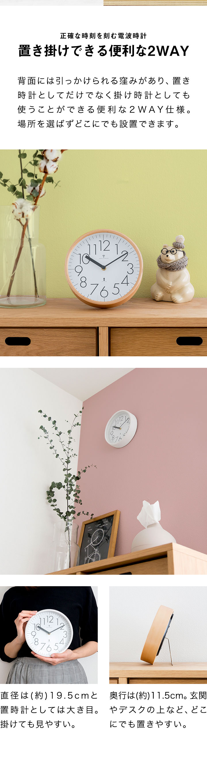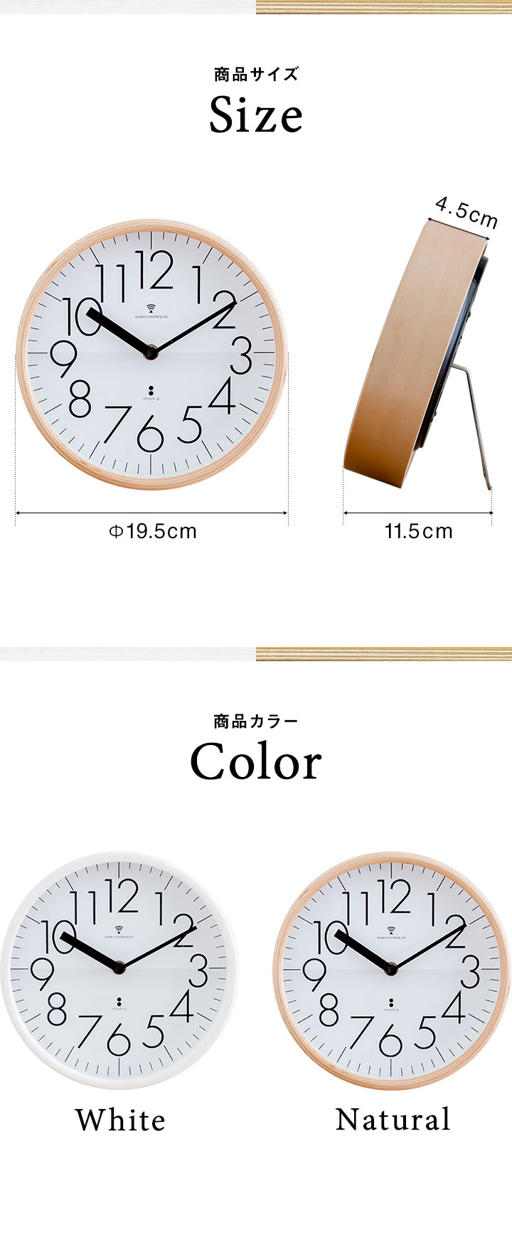 | サイズ: (約)直径19.5cm×奥行き11.5cm ※上記はスタンドを含めたサイズです。 ※時計本体の奥行は4.5cmです。 |