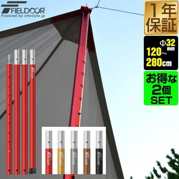 テントポール アルミ製 2本セット 直径 32mm 高さ120 - 280cm 8段階 アルミ サブポール タープポール 収納バッグ キャノピー 用 FIELDOOR 送料無料