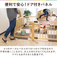 本品は、付属する8つのサークルパネルのうち1つがドア付きパネルになっており、大人が入る際にまたがなくても入りやすい仕様です。子供を抱っこしながらでもラクに入れるので、ママにもお子さまにも安全です。
