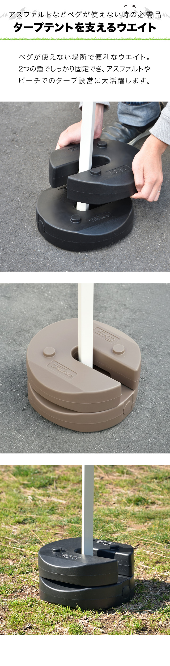 2つの錘でしっかり固定でき、アスファルトやビーチでのタープ設営に大活躍します。